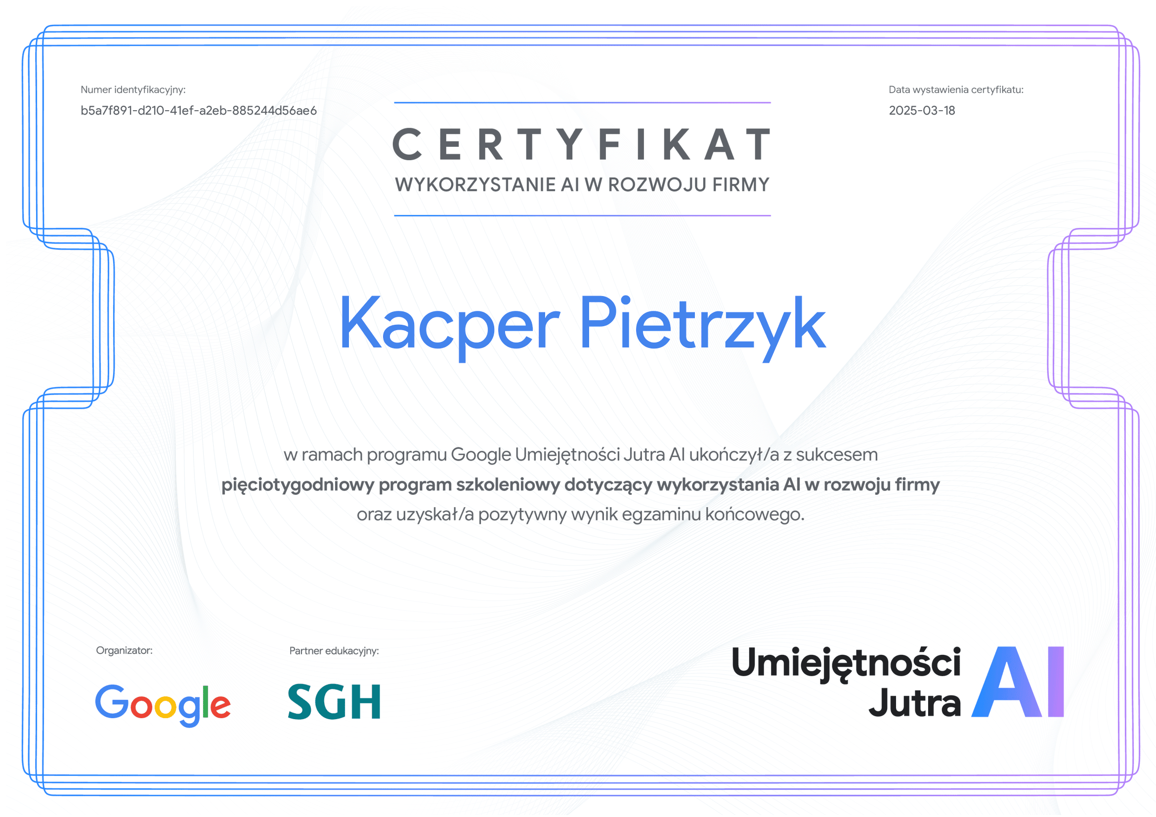 Stale rozwijam swoje kompetencje i śledzę najnowsze rozwiązania w branży. Regularnie uczestniczę w szkoleniach i zdobywam certyfikaty potwierdzające wiedzę. Ostatnio ukończyłem kurs Google z zakresu sztucznej inteligencji i automatyzacji, aby lepiej rozumieć wyzwania współczesnego internetu i dostarczać jeszcze skuteczniejsze rozwiązania.